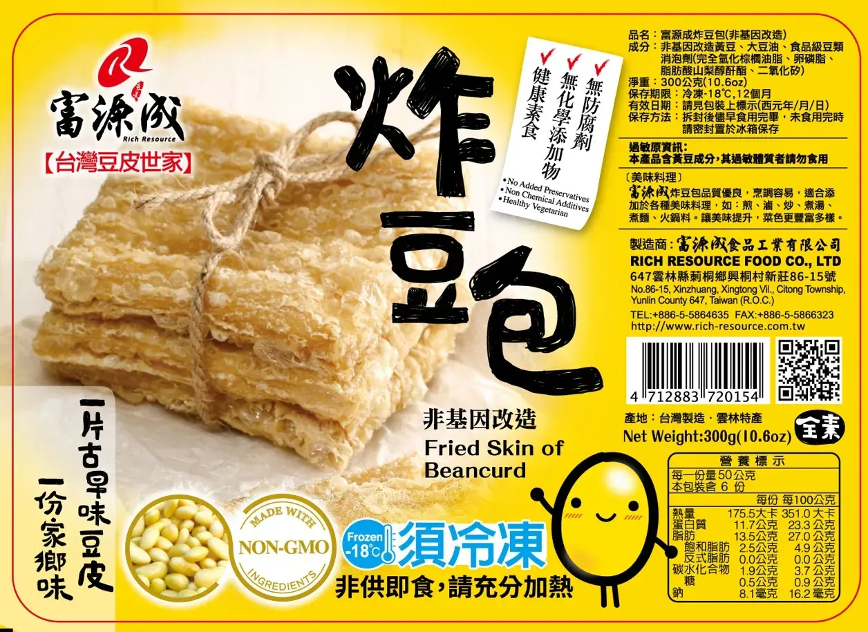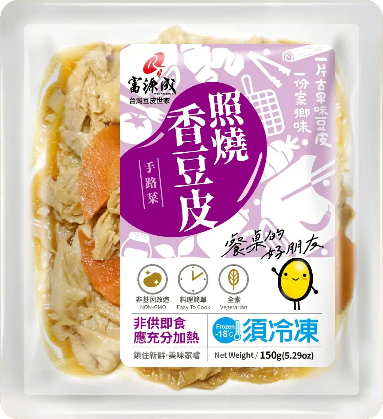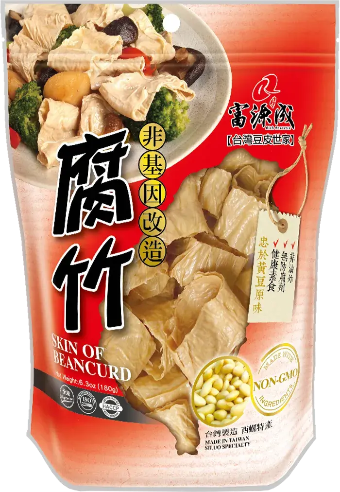 從一顆黃豆開始的 台灣故事 還記得小時候,阿嬤總是天還沒亮就開始忙碌那股瀰漫的豆香,是家的味道,也是愛的味道 富源成從 1973年 那個純樸的年代開始一顆顆精選黃豆,在師傅們的巧手下慢慢蛻變成一片片金黃透亮的豆皮這不只是製作,更是一份對家人的牽掛 四十多年來我們始終相信,食品是良心事業每一個環節都不能馬虎從挑選、研磨、熬煮到成型,層層工序背後是對品質的堅持,是對每個家庭餐桌的責任 大家都在買 Hot Product 從原料到包裝全程把關,最受歡迎的豆香好物一次帶回家 常溫 乾燥保存 腐竹 非基因改造 NT$ 888 冷凍 -18°C 保存 照燒香豆皮 加熱即食 NT$ 888 冷凍 -18°C 保存 炸豆包 基因改造, 非基因改造 NT$ 888 好逛又好選 Product Category 多元商品清楚分類,讓你快速找到最適合的豆類好物 豆包豆腸系列 乾貨系列 麵製品系列 煙燻系列